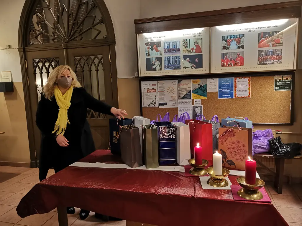 Pēc Svētās Mises draudzes trūcīgie saņēma dāvanas, kuras pasniedza “Caritas” grupas brīvprātīgie.