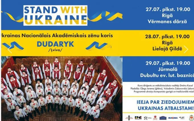 Laikā no 27. līdz 29. jūlijam Latvijā viesosies Ukrainas Nacionālais akadēmiskais zēnu koris „Dudaryk“ (Ļviva). Paredzēts, ka koris uzstāsies Rīgā un Jūrmalā, un koncertos saziedotie līdzekļi tiks izmantoti Ukrainas atbalstam.