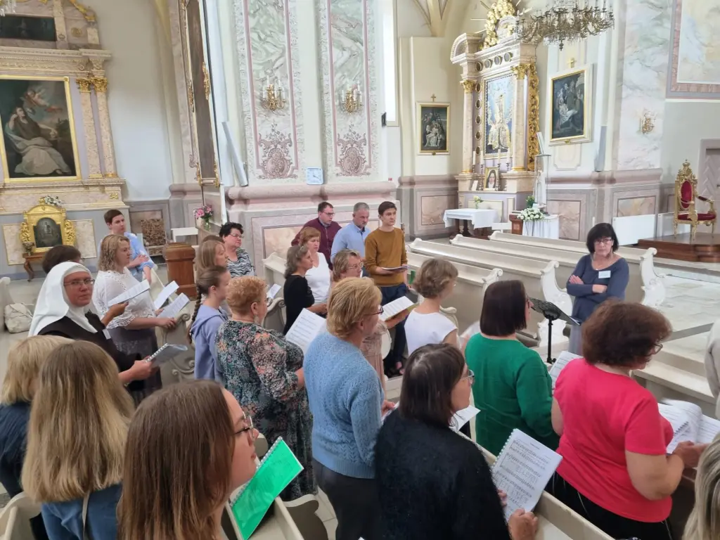 Katru dienu notika intensīvi dalībnieku kora mēģinājumi, kurus vadīja diriģentes Ieva Lazdāne un Anda Lipska, lai sagatavotos Svētās Mises dziedāšanai noslēguma dienā. Ērģelniekiem bija iespēja iejusties dziedātāju lomā un vienlaikus būt arī meistarklašu dalībniekiem, iedvesmojoties darbam ar ansambli, kori savās draudzēs. Svētās Mises dziedājumi iepriekš tika atlasīti atbilstoši parastā liturģiskā laikposma XVI nedēļas ceturtdienas (šogad 27.jūlijā) tematikai. Liels paldies Solvitai Ivanovai, Andrim Bižānam un māsai Marijai Stefanai par dalīšanos ar dziesmu un dziedājumu notīm kursu materiāliem!