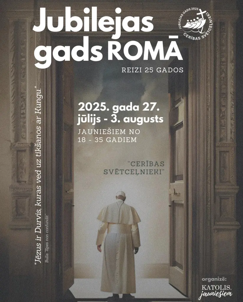 Līdz šim aptuveni 30 jaunieši ir pietiekušies, lai kopā dotos uz Jauniešu jubileju Itālijas galvaspilsētā Romā, kas Jubilejas gada ietvaros norisināsies no 28.jūlija līdz 3.augustam. Lai arī Latvijas jaunieši tika aicināti pieteikties līdz 15.februārim, pieteikšanās pagarināta līdz 15.martam, ziņo Rīgas arhidiecēzes jauniešu darba koordintore Anda Aleksandrova. Tas tāpēc, lai tiem, kuri līdz šim vēl dažādu iemeslu dēļ lēmumu par došanos uz Romu nevarēja vai nespēja pieņemt, dāvātu iespēju pievienoties.