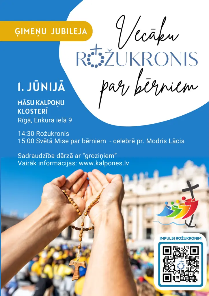 No 30.maija līdz 1.jūnijam Romā Jubilejas gada ietvaros norisināsies Ģimeņu, bērnu, vecvecāku un senioru jubileja. Lai svinētu šo notikumu arī tepat Latvijā, māsas kalpones 1.jūnijā aicina uz savu klosteri Ķīpsalā.