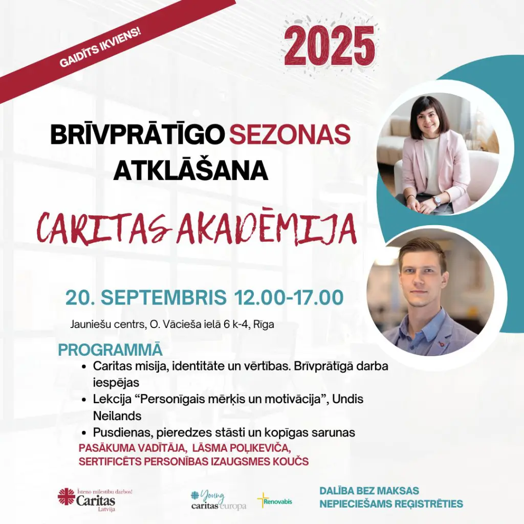 Šonedēļ brīvprātīgo sezonu atklās nodibinājums “Caritas Latvija”, sestdien, 20. septembrī, aicnot uz pasākumu “Caritas Akadēmija” visus tos, kuri jau veic brīvprātīgo darbu, kā arī apsver iespēju šajā jomā darboties nākotnē.