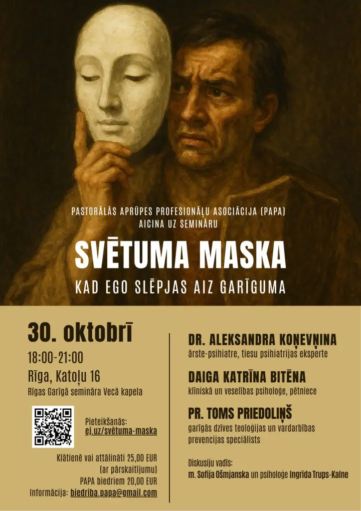 Oktobra beigās uz kārtējo semināru aicina Pastorālās aprūpes profesionāļu asociācija (PAPA). Seminārā „Svētuma maska: kad ego slēpjas aiz gariguma“ uzmanība tiks pievērsta jautājumam par garīgo narcisismu.