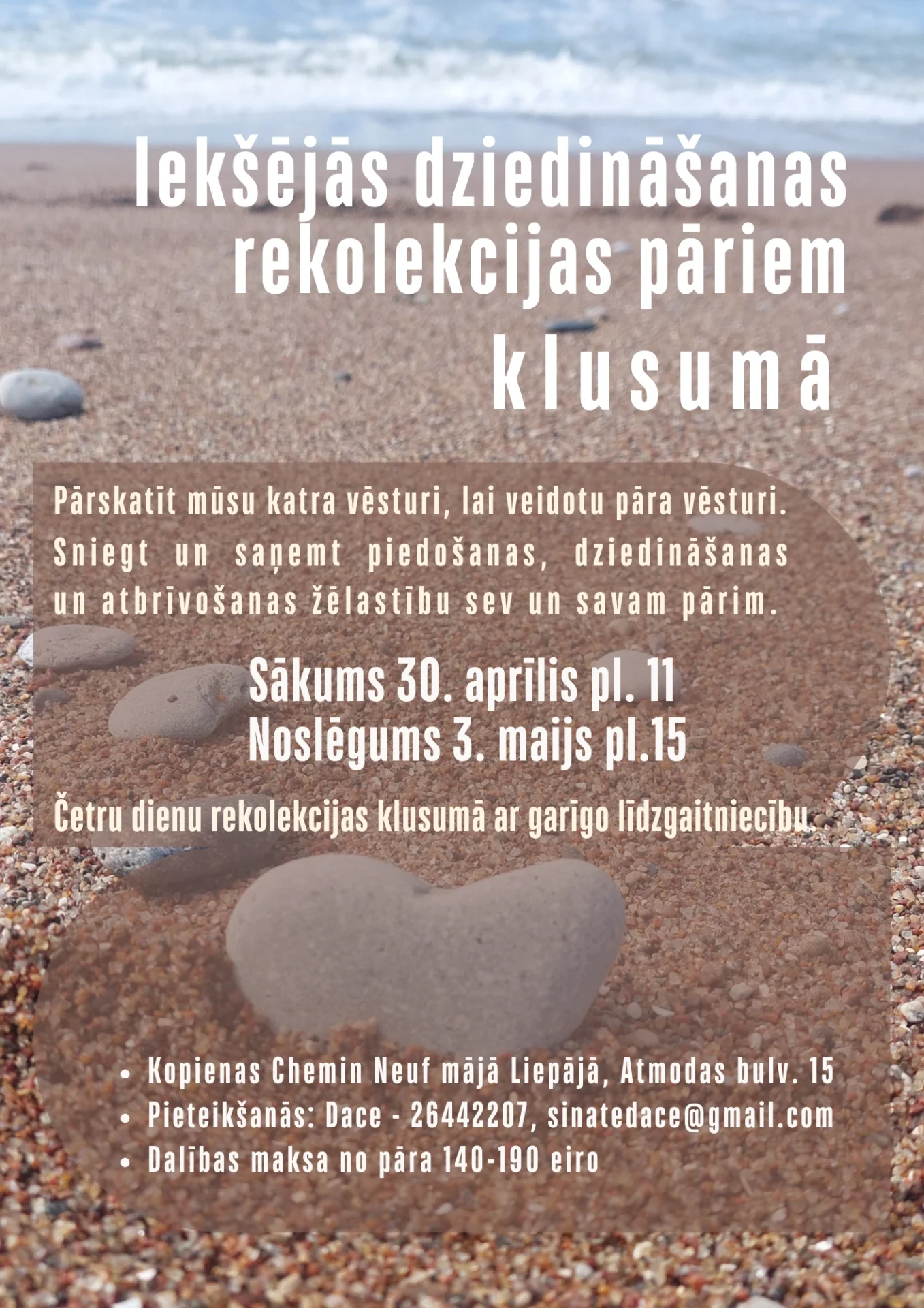 Home Visi notikumi Iekšējās dziedināšanas rekolekcijas pāriem klusumā Iekšējās dziedināšanas rekolekcijas pāriem klusumā Tags: katolislv, rekolekcijas Date 30.04.2026. - 03.05.2026. Kategorijas Rekolekcijas